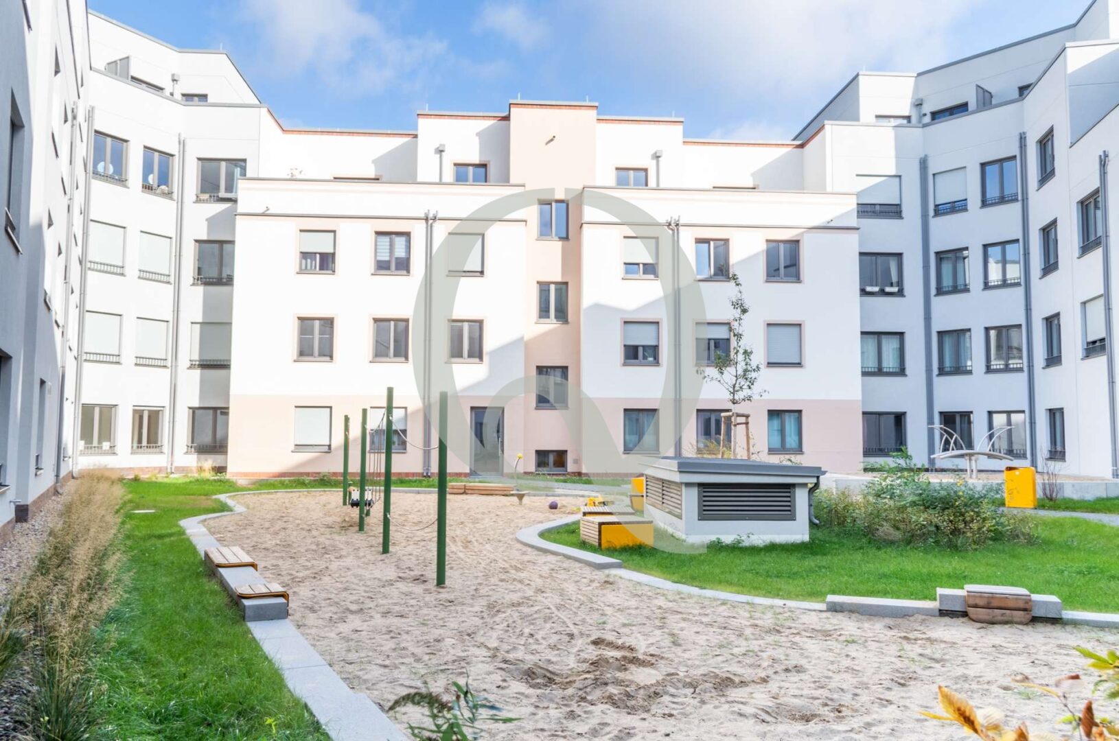 + Großzügiger, moderner Spielplatz im Innenhof, ideal für Familien. Der Spielplatz bietet eine sichere Umgebung für Kinder mit verschiedenen Spielgeräten und lädt Eltern zum Verweilen ein.