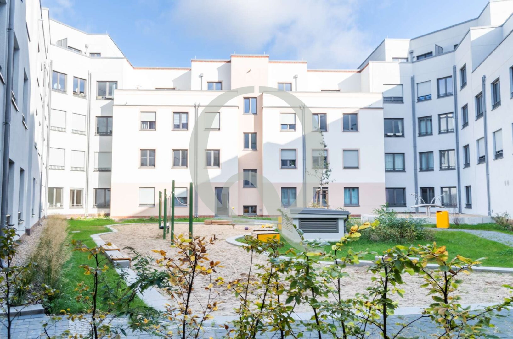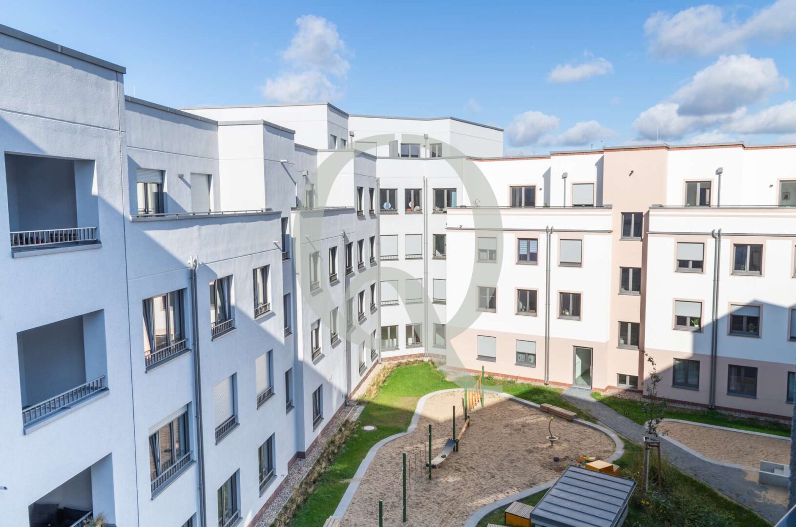 + Großzügiger, moderner Spielplatz im Innenhof, ideal für Familien. Der Spielplatz bietet eine sichere Umgebung für Kinder mit verschiedenen Spielgeräten und lädt Eltern zum Verweilen ein.