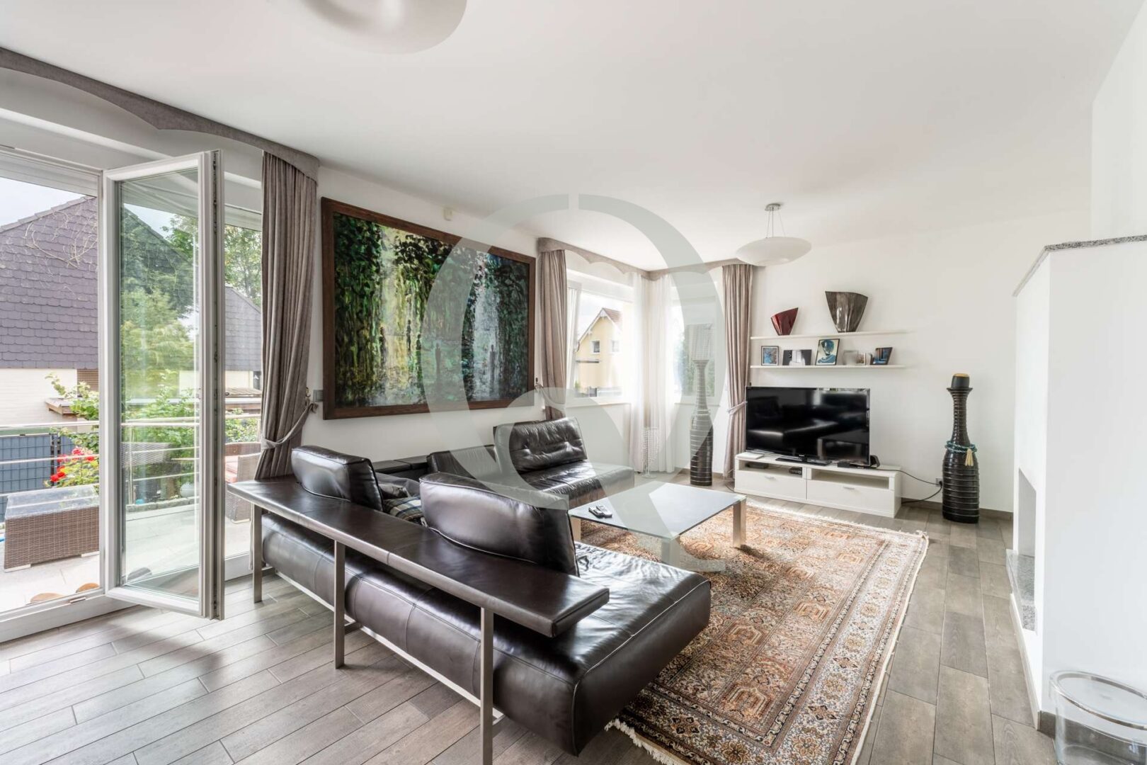 Im Erdgeschoss finden Sie einen weitläufigen, lichtdurchfluteten Wohnbereich mit Zugang zur Sonnenterrasse und zum blickdichten Garten, ein weiteres Zimmer mit Ankleidenische sowie ein Gäste-WC mit Dusche.