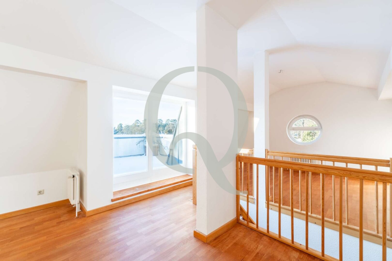 Das Dachgeschoss ist offen gestaltet, mit viel Licht, Parkettboden und Zugang zur großen Dachterrasse mit Weitblick ins Grüne – ein echtes Highlight des Hauses.