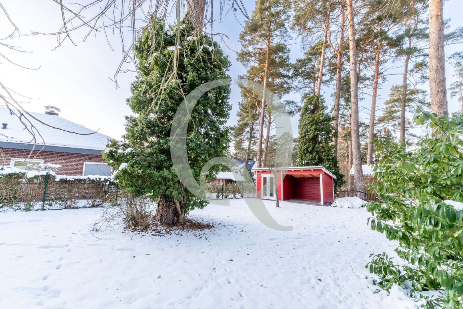 Der Garten bietet viel Platz für Entspannung, Spiel und Gartenarbeit – inklusive praktischem Abstellhaus für Geräte.