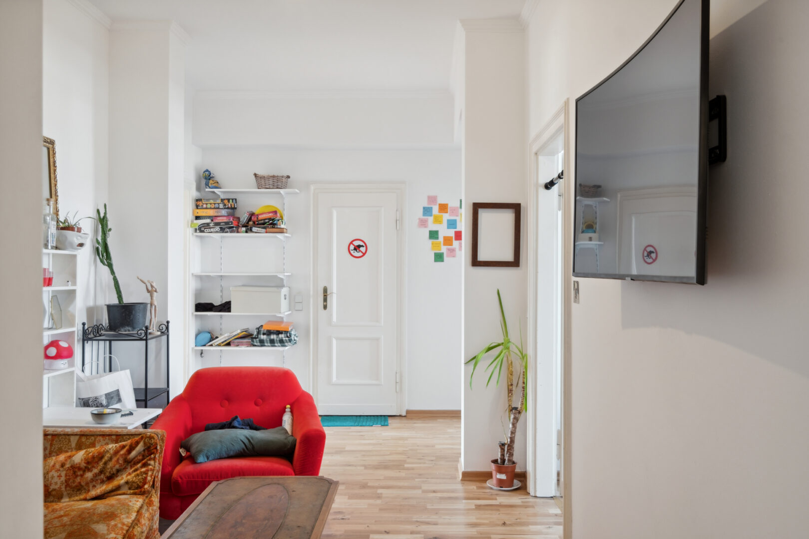 Der Flur ist sehr geräumig und wurde von den Vormietern (Wohngemeinschaft) als Wohnzimmer/ Aufenthaltsraum genutzt.